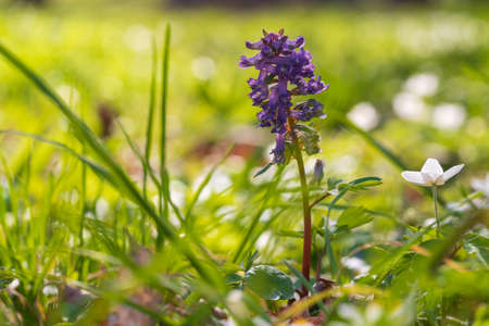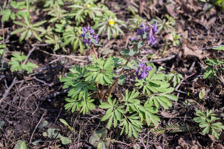 Corydalis. Corydalis solida. Violet flower forest blooming in spring. The first spring flower, purple. wild corydalis in nature.
