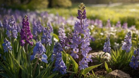 A picturesque field filled with a vibrant array of purple and white flowers swaying gently under the bright sun, creating a stunning view