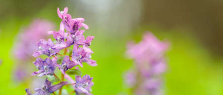 Corydalis solida close-up. Purple corydalis flower on a blurred background. spring concept