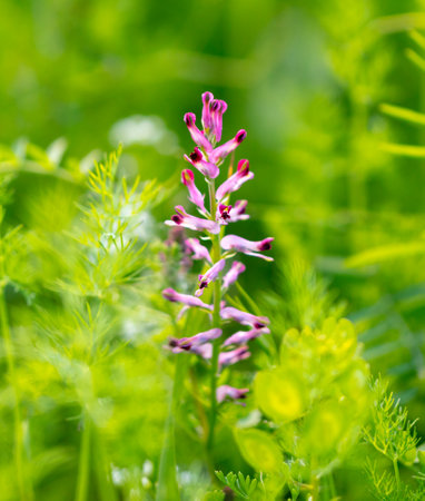 Macro view of pink flowers of a Fumaria (Fumaria officinalis) plant in a green field with more flowers of the same species