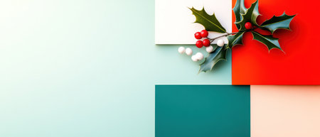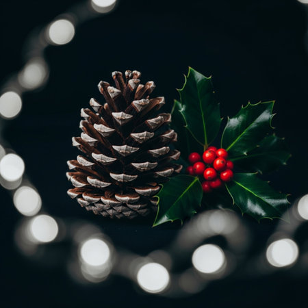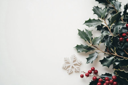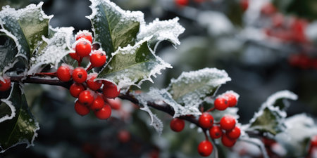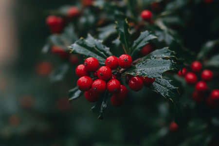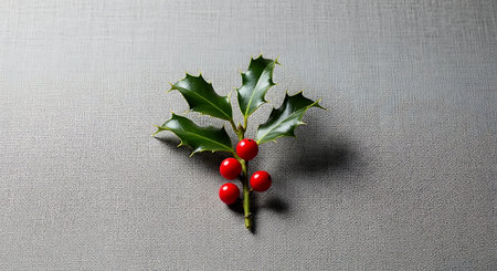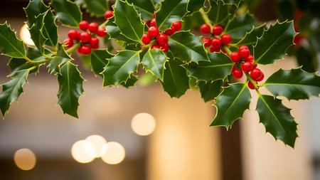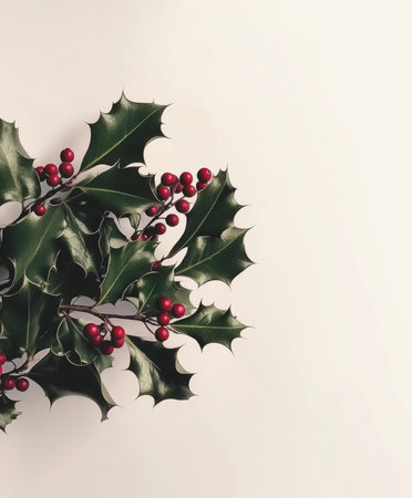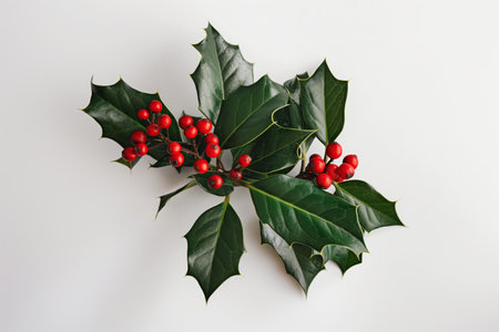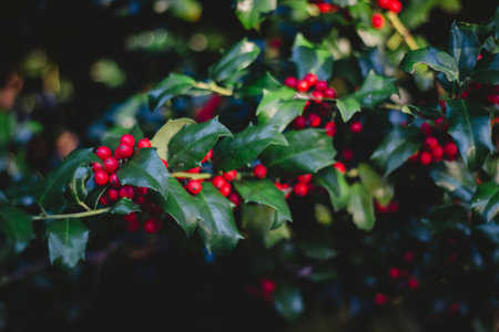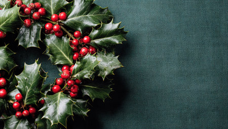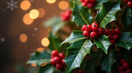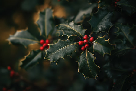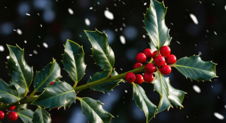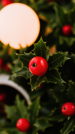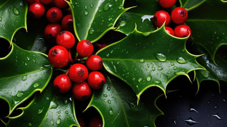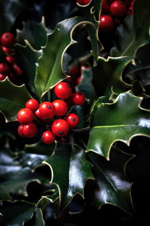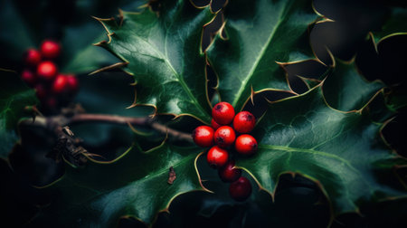 Beautiful holly leaves adorned with bright red berries create a vibrant and festive composition, ideal for capturing the essence of the holiday season and Christmas joy.