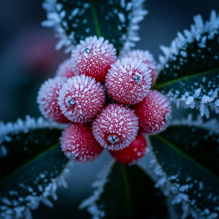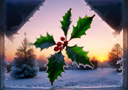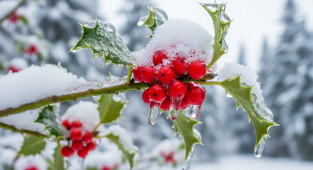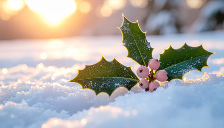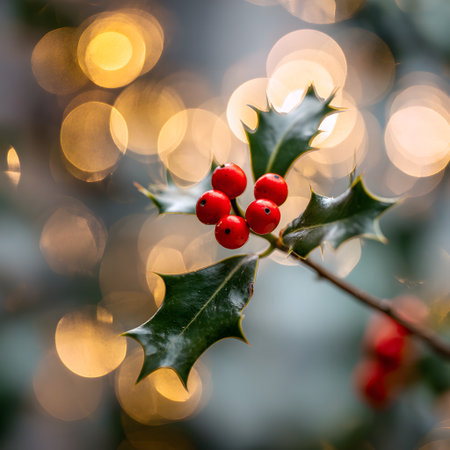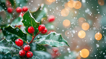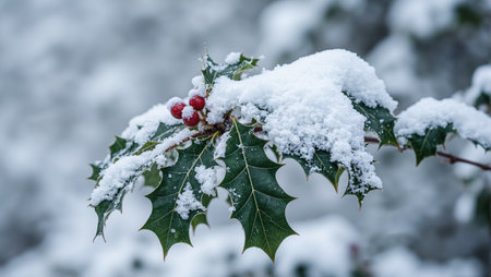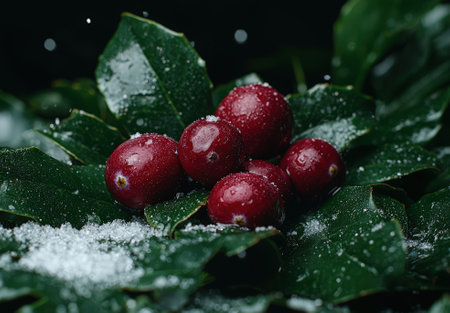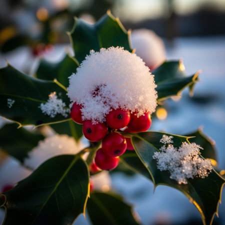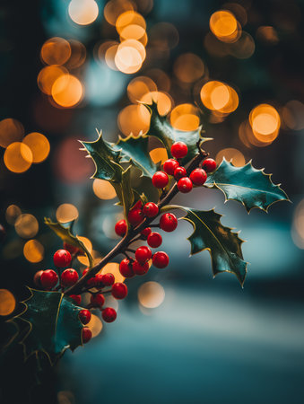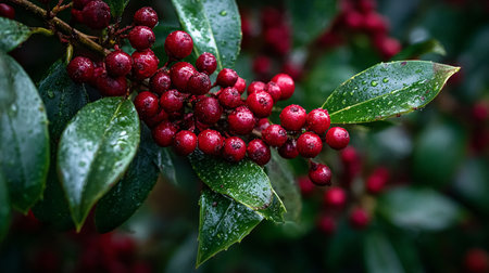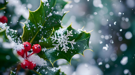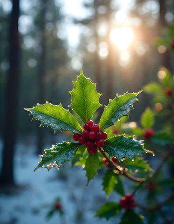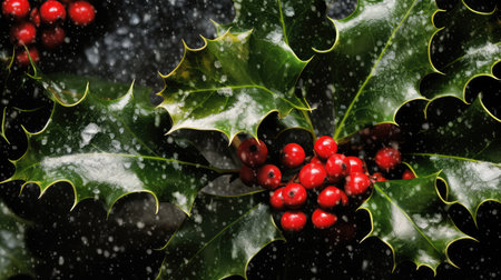 A close-up shot of fresh holly leaves, glistening with morning dew, adorned with vibrant red berries, signifying the joyous arrival of Christmas