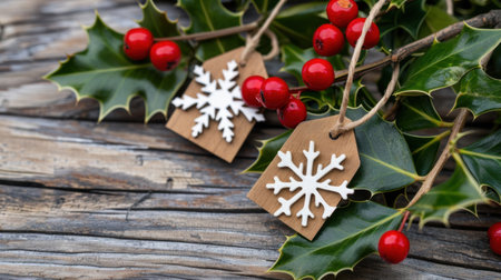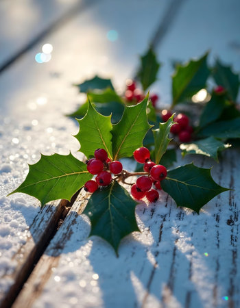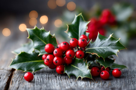 Festive holly sprigs with red berries on rustic wooden surface evoke holiday cheer and natural beauty.