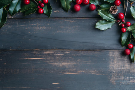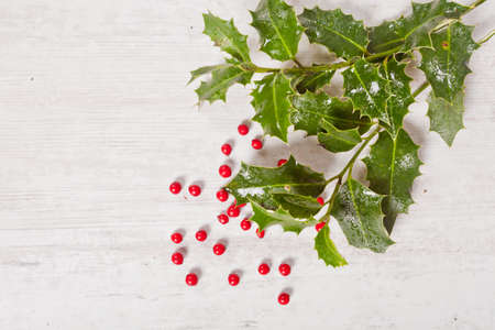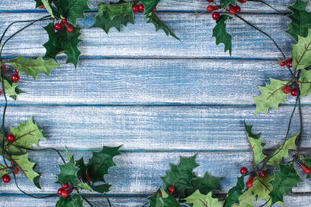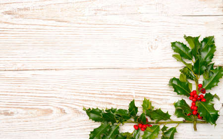 Holly twigs over wooden planks with copy space