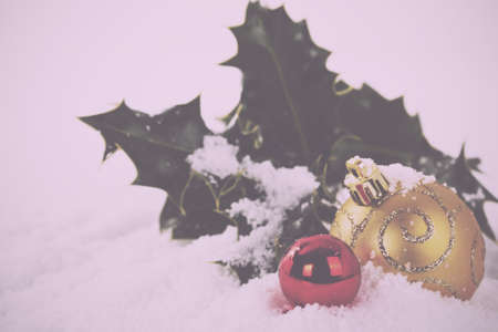Chrismas decorations with holly on a white snow background Vintage Retro Filter.