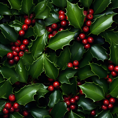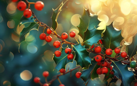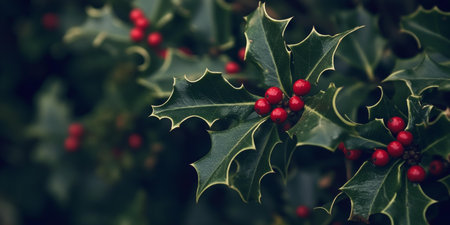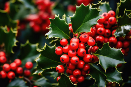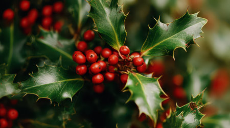 Vibrant green holly leaves with clusters of red berries, symbolizing festive christmas decor
