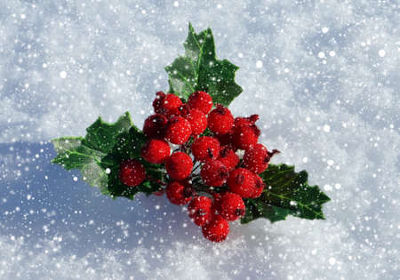 Holly leaves with berries on snow. Christmas and New Year background.