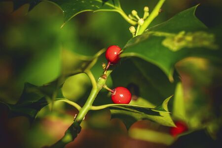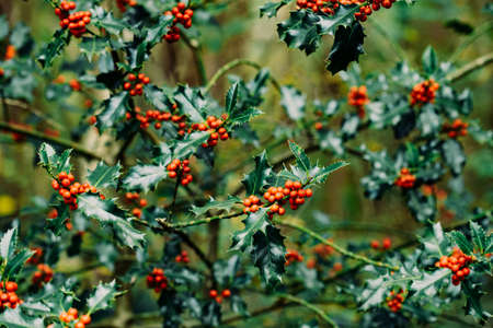 Symbol of Christmas in Europe. Close-up of holly acicular - beautiful red berries and sharp leaves on tree in cold winter weather.
