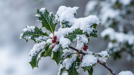 A close up of a festive holly bush with bright red berries and glossy green leaves dusted with a layer of white snow creating a beautiful winter scene.