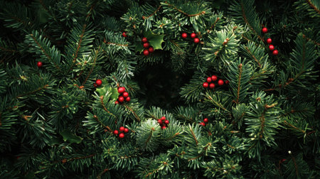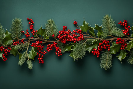 Evergreen branches adorned with red berries create a festive atmosphere suitable for holiday decorations and celebrations.