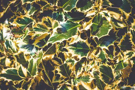 Fresh green Holly leaves (Ilex aquifolium (meserveae) in a summer garden. Selective focus. Close-up.