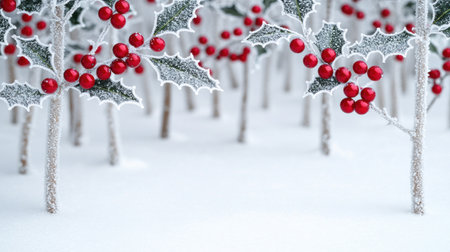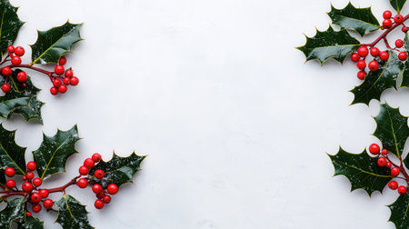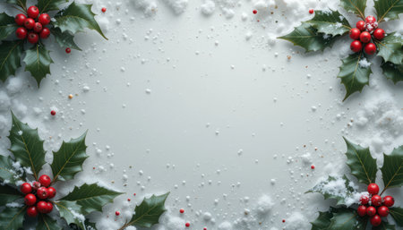 Bright holly leaves and red berries create a festive border on a snowy background. Perfect for holiday designs, invitations, or seasonal decorations.