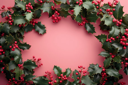 Festive Christmas wreath with holly leaves and berries on pink background with copy space