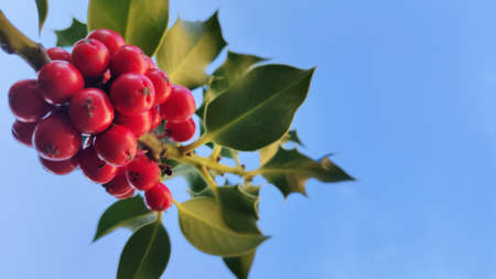 Holly leaves and red berries on a blue sky background. Seasonal natural background.