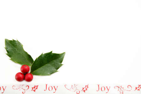Holly leaves and berries with a decorative ribbon with the words Joy. Room for your text.