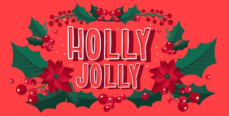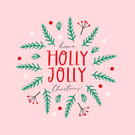 Holly Jolly lettering card and hand drawn festive christmas decorative elements, florals and branches. Hand drawn vintage style