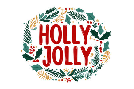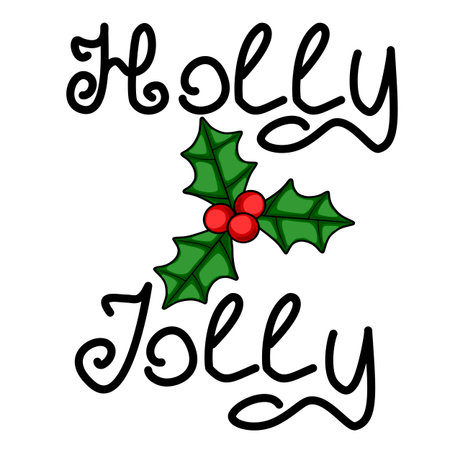 Whimsical hand-drawn vector lettering of "Holly Jolly" adorned with a vibrant sprig of mistletoe, perfect for festive holiday designs.