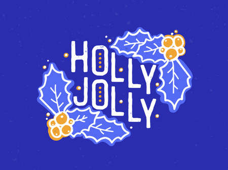 Holly Jolly inscription written with elegant calligraphic font. Handwritten holiday message or wish decorated with hand drawn leaves and berries. Festive seasonal trendy vector illustration