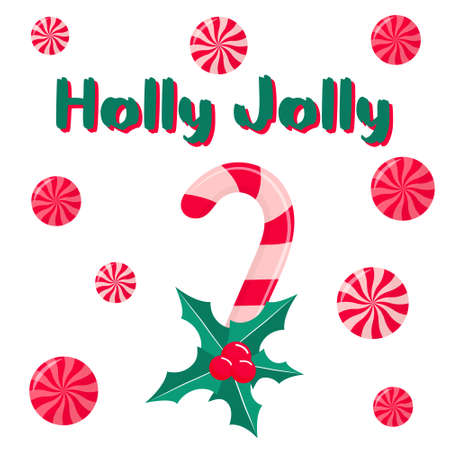 Candy cane with holly and lollipops. Holly Jolly text. Christmas banner.