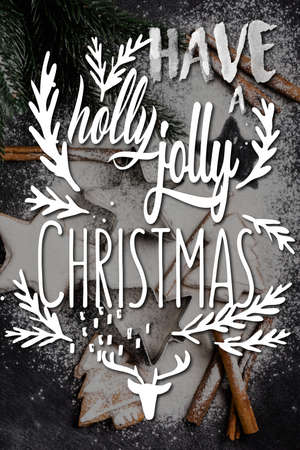 Top view of gingerbread cookies near pine covered with sugar powder and holly jolly christmas lettering