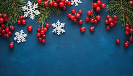 Christmas background with red berries and snowflakes on blue. Top view with copy space