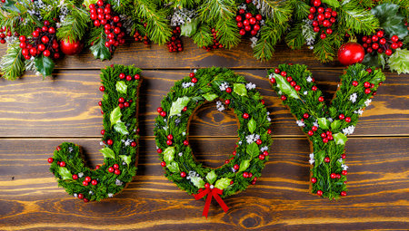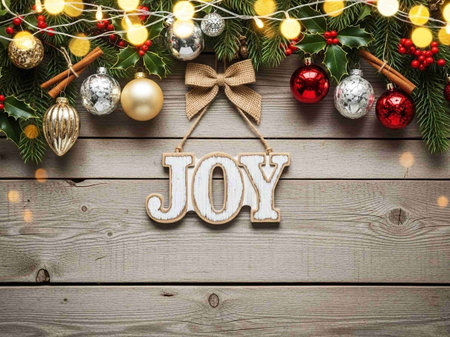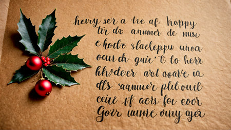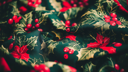 Bright red berries on holly branches create a joyful, festive atmosphere.