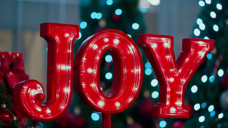 Red lit Christmas sign with glowing word Joy, surrounded by festive decorations, spreading holiday cheer.