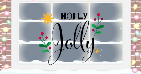 Composition of holly jolly text over window at christmas. christmas, winter, tradition and celebration concept digitally generated image.