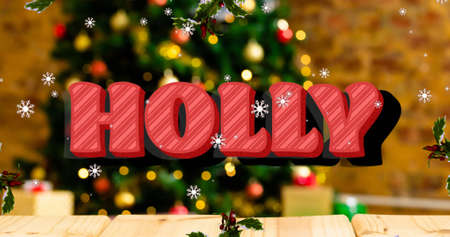 Image of holly text over stars falling and christmas decoration on table. christmas, winter, tradition and celebration concept digitally generated image.