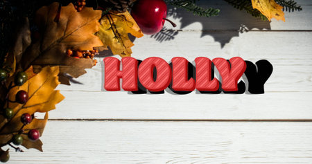 Showcasing decorative sign 'Holly' on wooden tabletop, with evergreen branches, red berries, cones. Festive, holiday, seasonal, rustic, cozy, celebration, winter