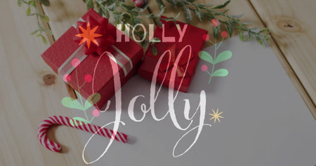 Holly Jolly text image over Christmas gifts and candy cane on wooden surface. holiday, festive, celebration, presents, decoration, seasonal