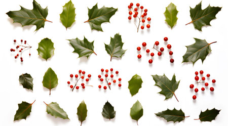 Green holly leaves and bright red berries isolated on a white background, symbolizing Christmas and winter holidays