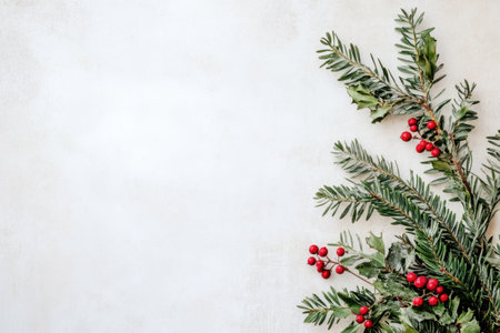 A close up of evergreen branches adorned with bright red berries set against a light neutral background perfect for holiday decor.