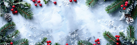 Winter flat lay background featuring Christmas decorations, including pine branches, berries, and pinecones, creating a festive atmosphere with ample copy space for mock-up design purposes