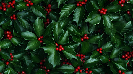 Lush green holly leaves adorned with vibrant red berries capture the festive spirit of the New Year season in a natural setting.