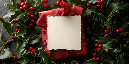 Blank cream colored square card on red gift with holly leaves and berries for Christmas decoration