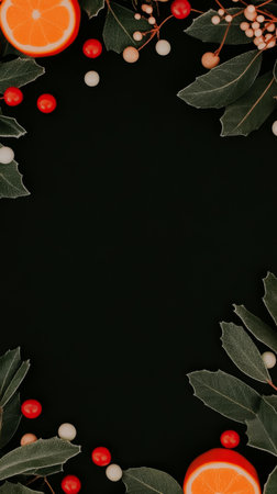 Abstract background with green Holy Berry leaves and baubles. Vertical composition.