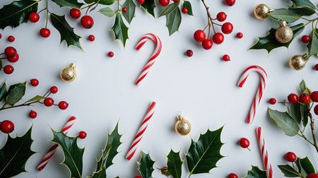 A beautiful festive arrangement featuring candy canes, red berries, and holly leaves, perfect for capturing the holiday spirit with vibrant colors and textures.