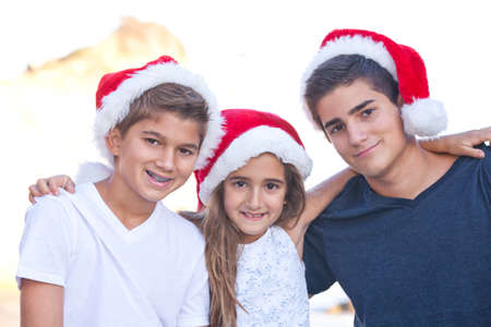 Siblings in Santa hats for a Christmas Family Portrait at t El Matador Beach,California