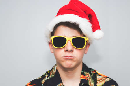 young teenage girl with tropical shirt and christmas hat on background
