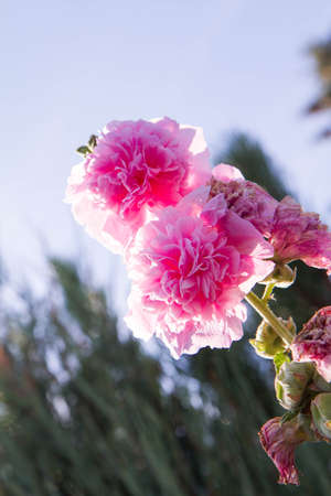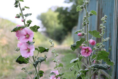 Pink Hollyhocks or Alcea flower cheerful blooming in natural park. Selective focus.