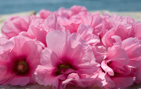Close up of pink common hollyhock (alcea rosea) flowers in bloom