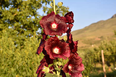 bright burgundy flowers hollyhock in the garden closeup, place for text