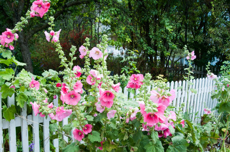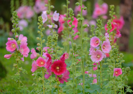 Beautiful pink hollyhock flowers blooming in a lush garden during the sunny spring season