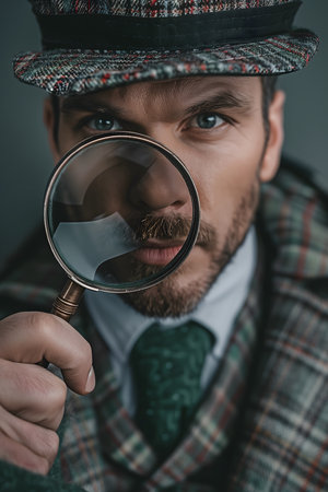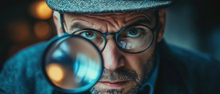 Detective peering through a magnifying glass, focused expression, low light, vintage filter