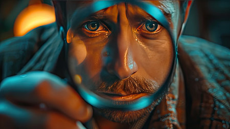 Intense close-up of a focused man examining something with a magnifying glass at night