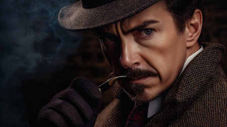 A detective in vintage attire, holding a pipe with a focused expression, exuding mystery and intrigue in a smoky, dimly lit setting.
