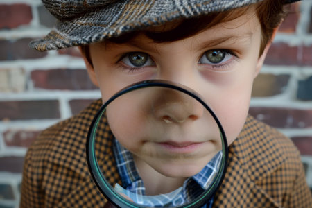 Little boy in hat looking through magnifying glass on brick wall background