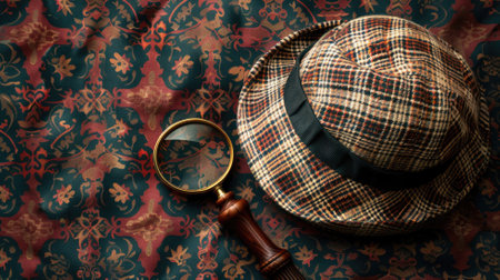 Checkered hat and magnifying glass on ornate patterned background