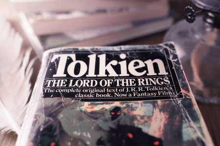 Celadna, Czechia - 04.03.2021: Vintage paperback edition of Tolkien's Lord Of The Rings open on the page with Middle-earth map focused on Bay of Belfalas